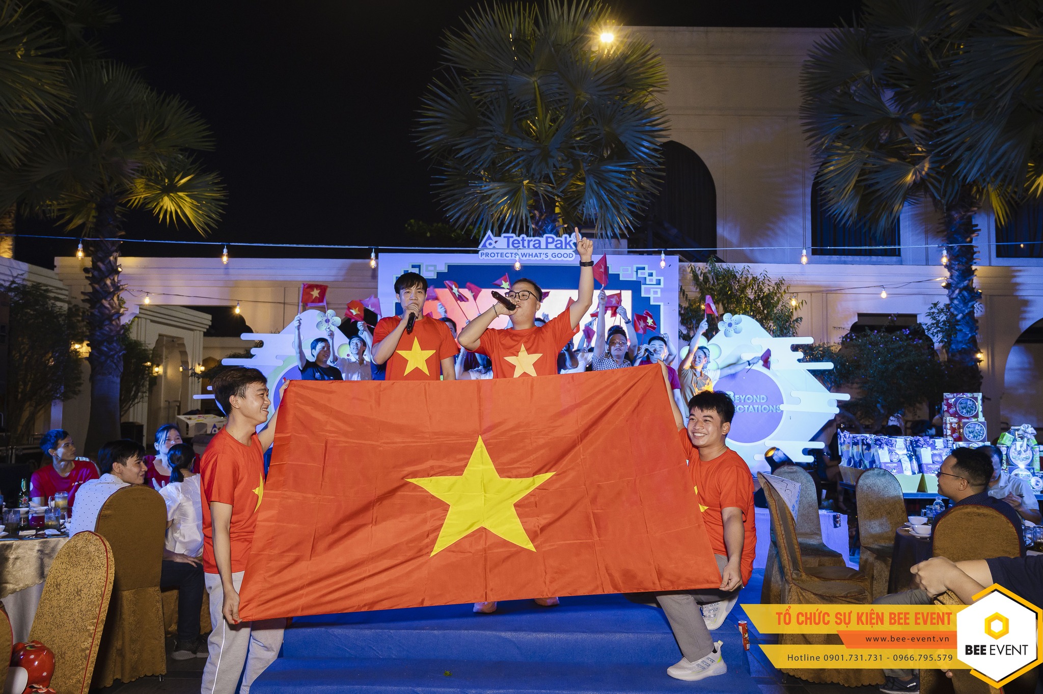 Ăn tiệc sương sương không quên nhiệm vụ ủng hộ đội tuyển Việt Nam, thỏa theo yêu cầu của đông đảo của khách mời, BEE EVENT đã cho phát sóng trực tiếp trận đấu lên màn hình LED sân khấu để mọi người cùng xem trực tiếp.